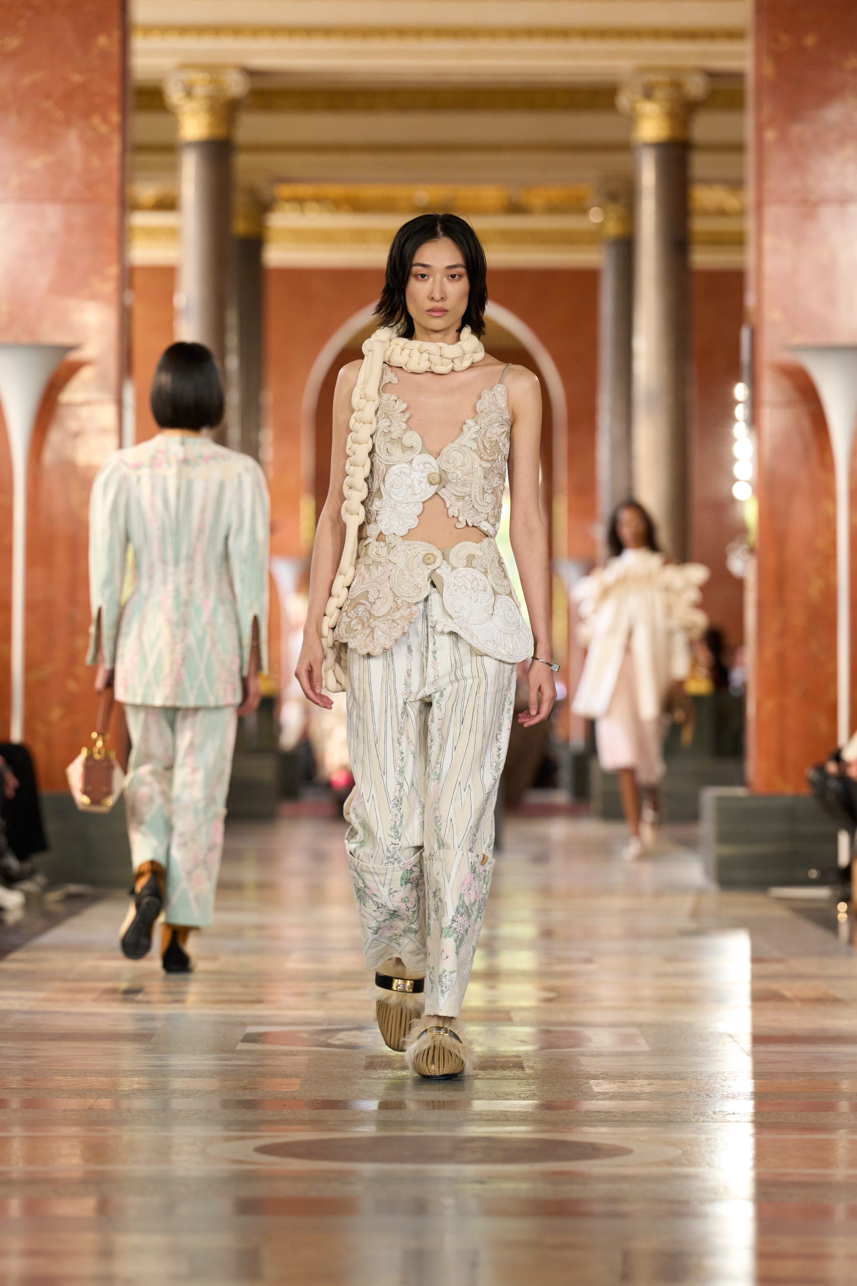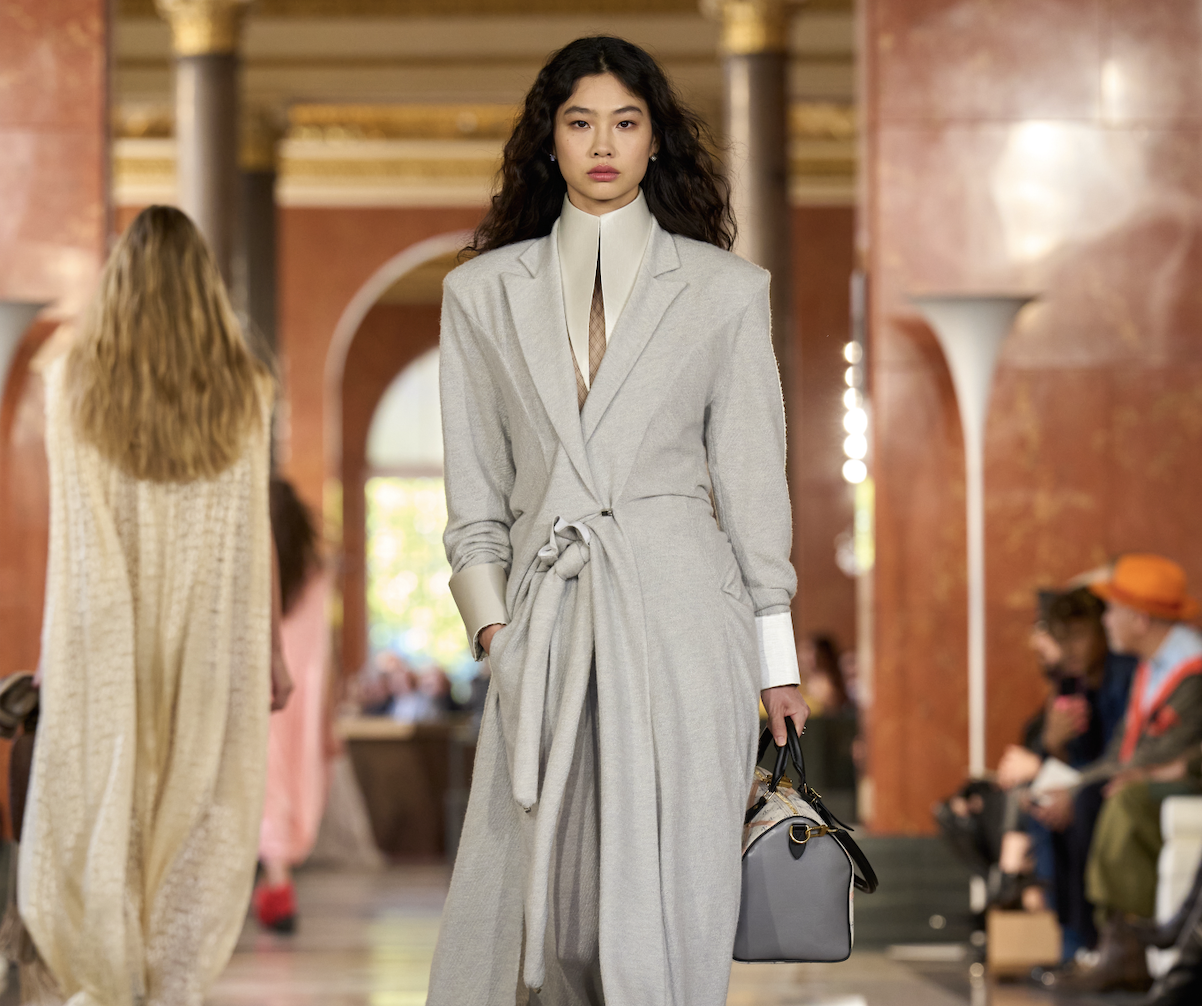 Les pièces se jouent des codes de l’intérieur, bousculant la frontière entre la pudeur et l’audace, entre la douceur du foyer et la sophistication du monde extérieur. Les silhouettes glissent entre ombre et lumière, enveloppées de matières fluides, de coupes qui caressent plus qu’elles ne contraignent. L’élégance se fait confidence. Le vêtement n’est plus une parure, mais un murmure, un geste intime qui raconte la personnalité sans jamais l’exhiber. Chaque pièce semble traversée par une idée de douceur et d’émancipation. Les lignes sont souples, les étoffes sensuelles, les détails discrets mais d’une précision absolue. Louis Vuitton explore ici l’idée d’un luxe qui ne cherche plus à impressionner, mais à exprimer. Une garde-robe pensée pour la sphère privée, pour ce moment secret où l’on s’habille avant de se montrer, où le vêtement devient miroir de l’âme.