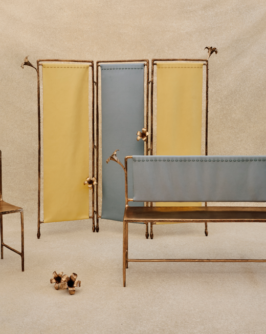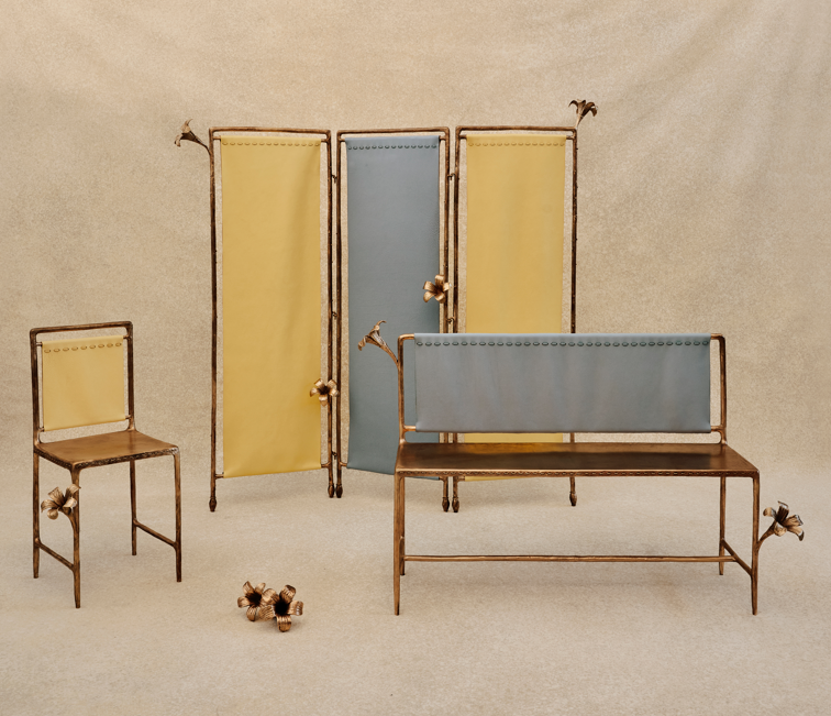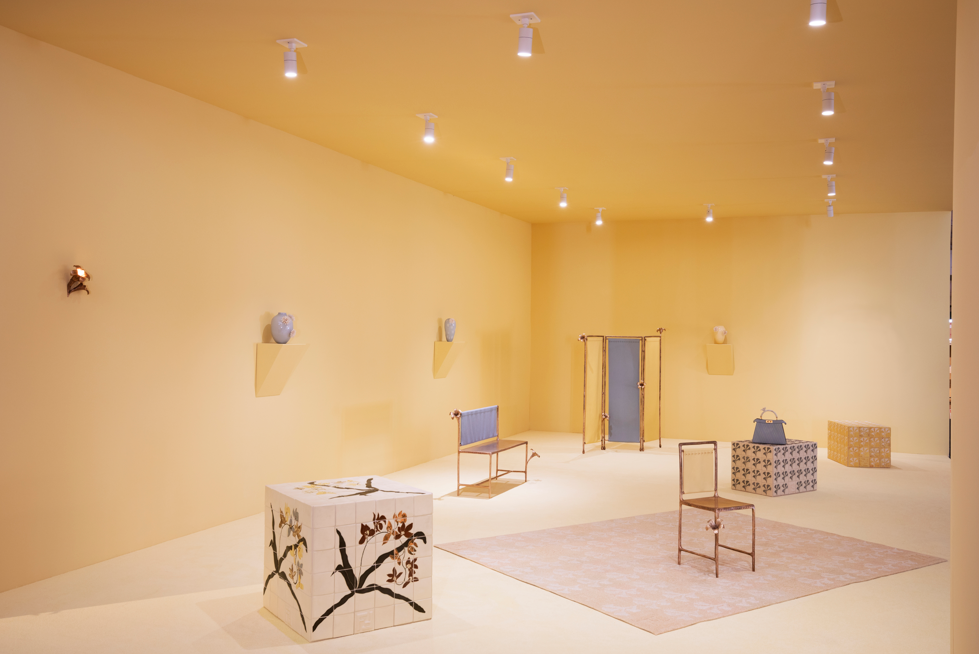 Les pièces sont réalisées dans des matériaux naturels travaillés à grande échelle. Le bronze sculpté, la céramique émaillée, la laine tuftée et le verre soufflé composent un ensemble cohérent, traversé par un motif récurrent, le lys, décliné en reliefs, gravures et volumes. Le vocabulaire formel emprunte à plusieurs registres : artisanat industriel, mobilier décoratif, références aux mouvements du début du XXᵉ siècle, Art nouveau, Art déco et modernisme. Les lignes restent lisibles, les volumes assumés. Le point de jonction réside dans le détail. La surpiqûre Selleria, signature de la Maison, embossée dans le bronze ou appliquée sur le cuir Cuoio Romano, brouille la frontière entre objet de design et geste issu de la maroquinerie.
