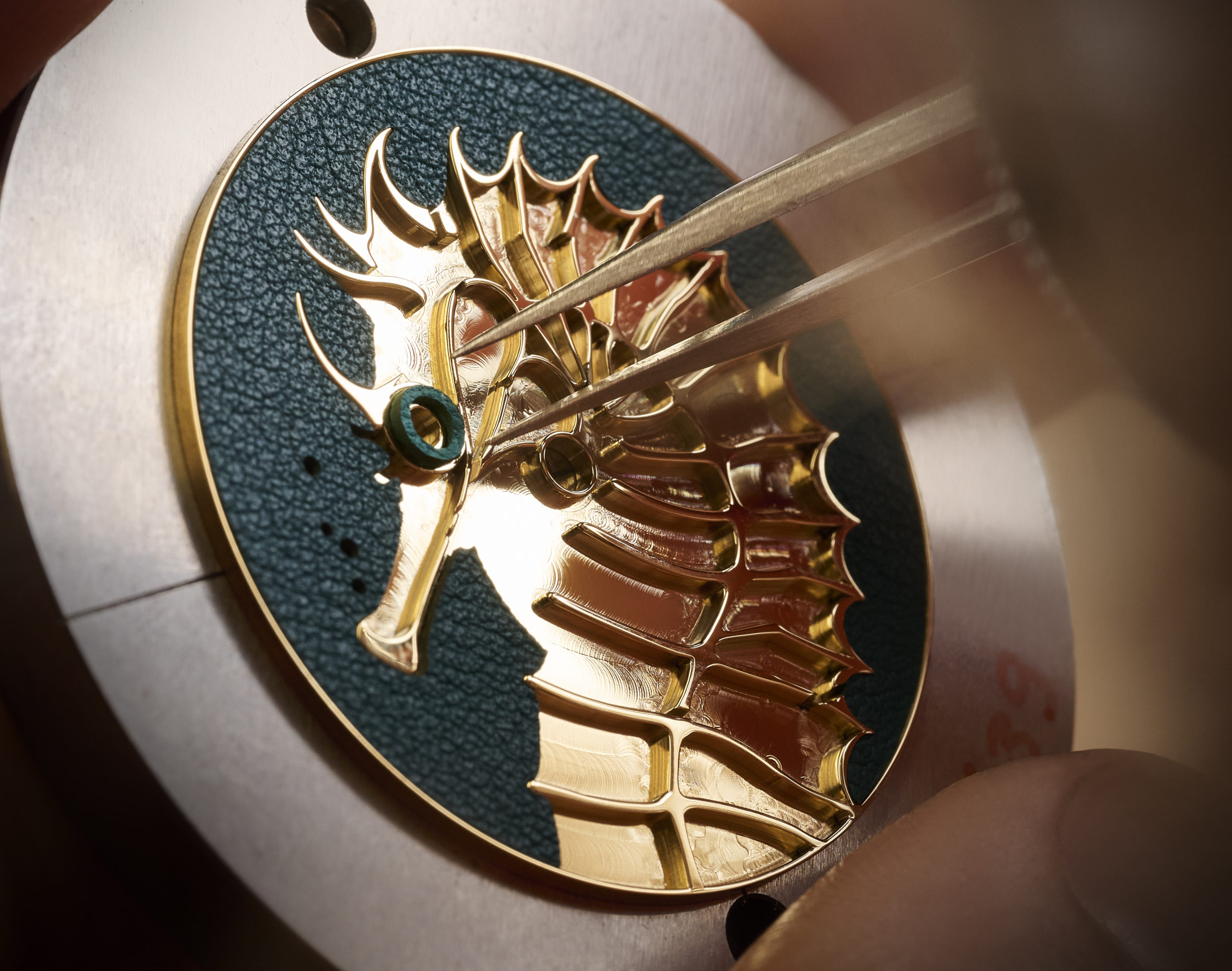 Issue de la pureté minimaliste de la collection Slim, cette édition se déploie comme la toile d’une odyssée, magnifiée par l’illustrateur Stuart Patience. L’hippocampe, ce « cheval de mer » chimérique, renaît grâce à la rencontre virtuose de deux disciplines majeures. La gravure trace avec précision les contours de la créature dans l’or blanc du boîtier de 39,5 mm. La marqueterie de cuir, un processus d’une exigence quasi obsessionnelle, transforme des peaux d’une finesse extrême, réduites à 0,5 mm, qui sont découpées puis assemblées fragment par fragment pour composer une mosaïque texturée et vibrante, comme jaillissant des abysses. Le cadran cesse d’être une simple surface et devient une matière vivante, une peau en dialogue avec le bracelet en veau Swift, dans les teintes béton ou perle.