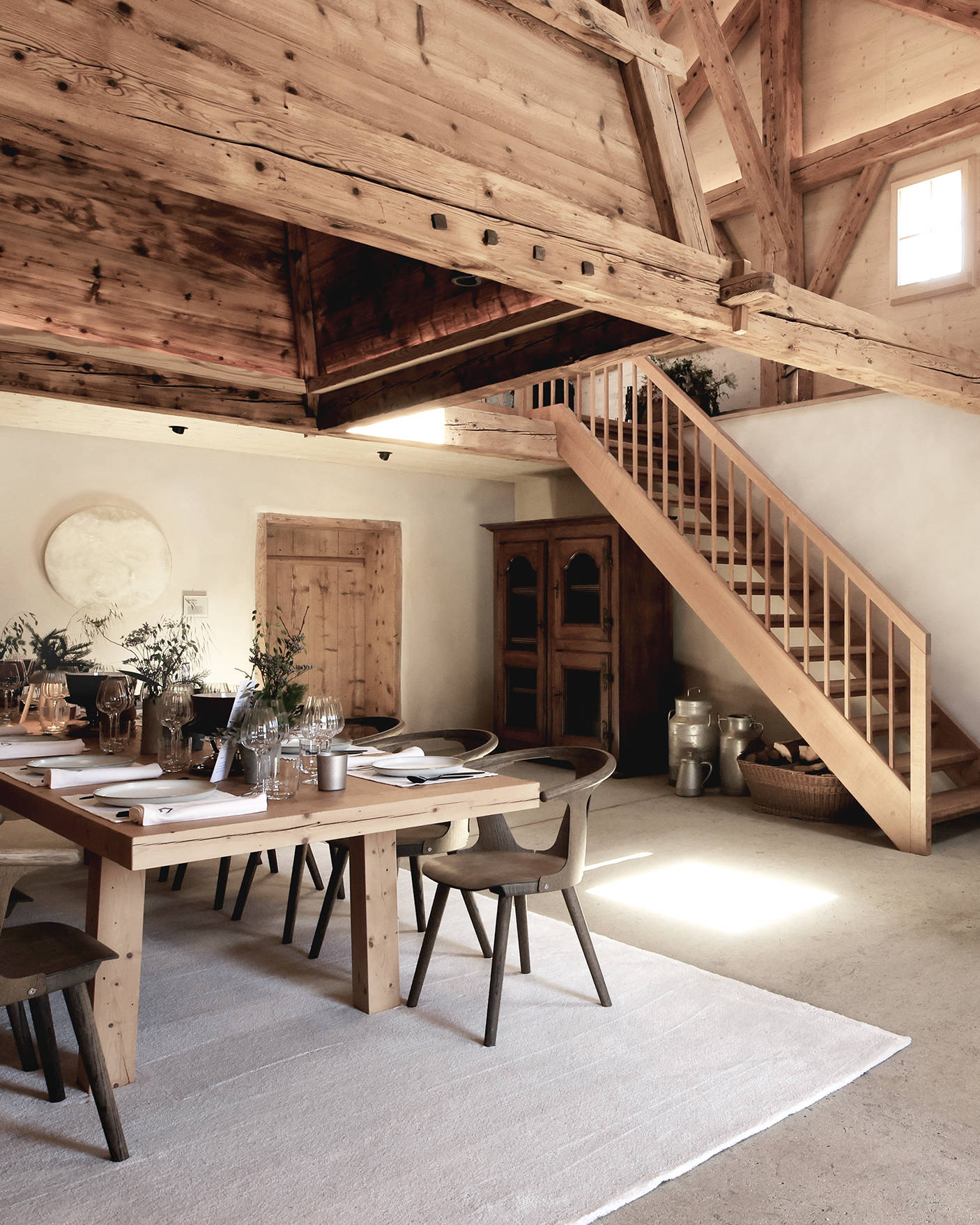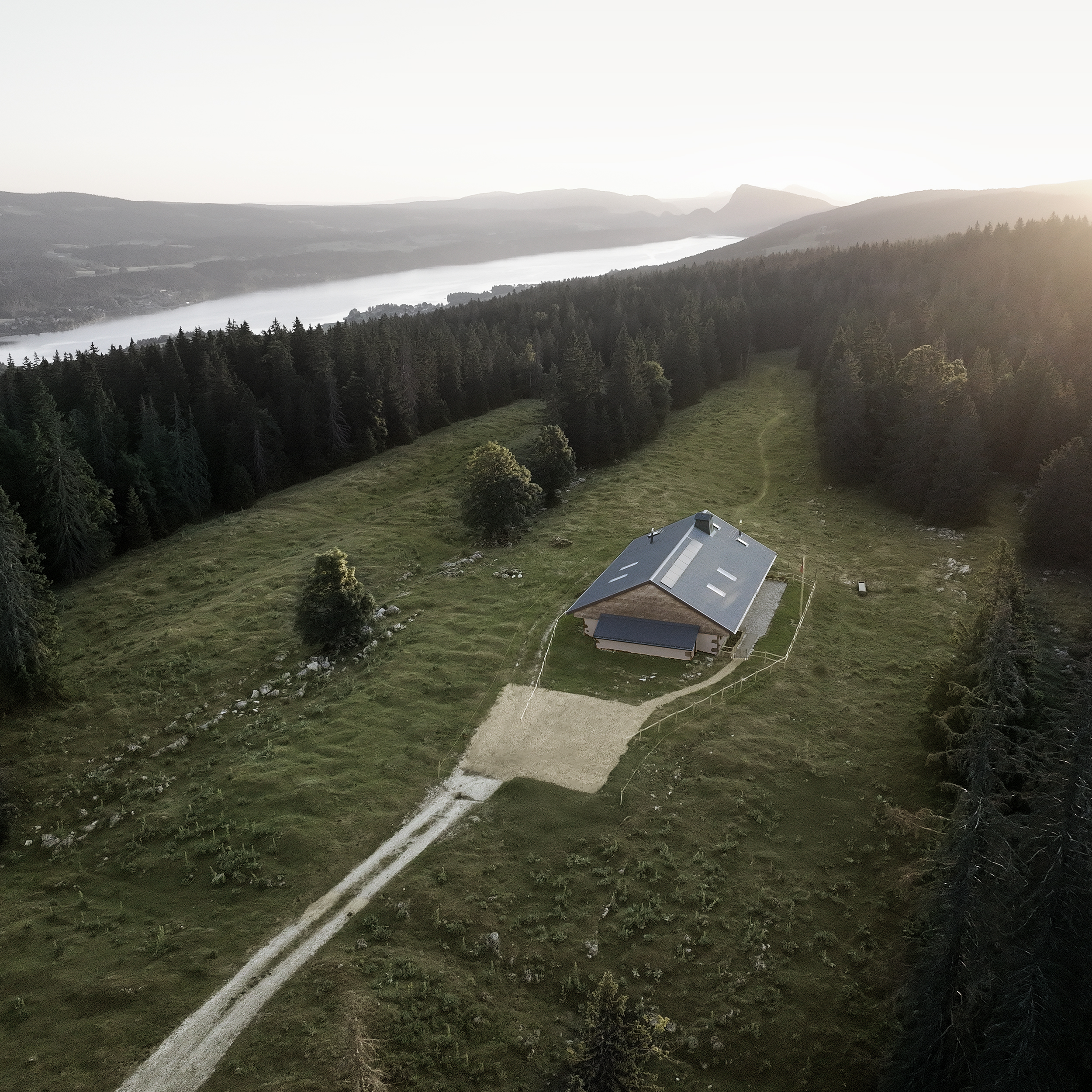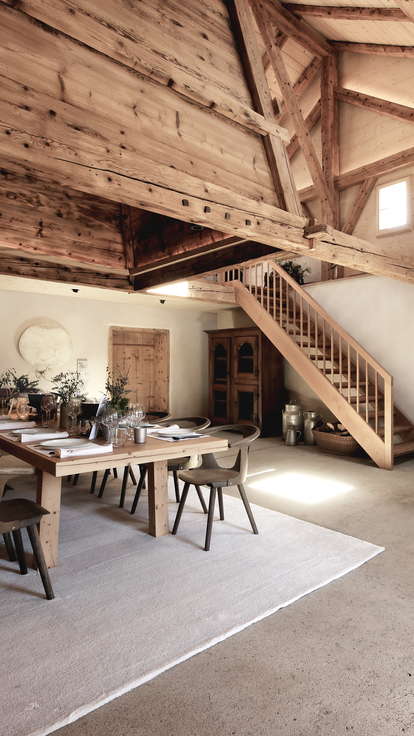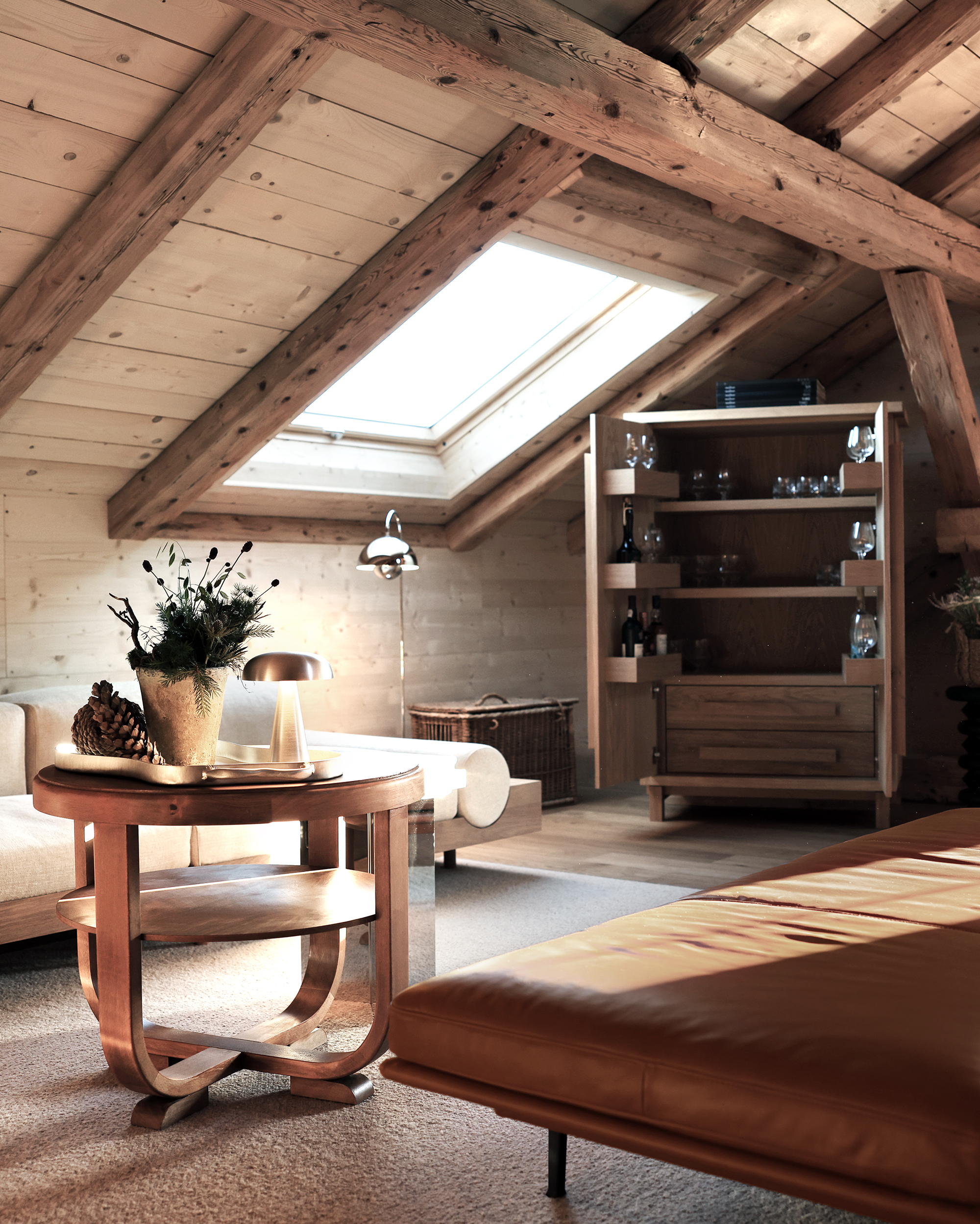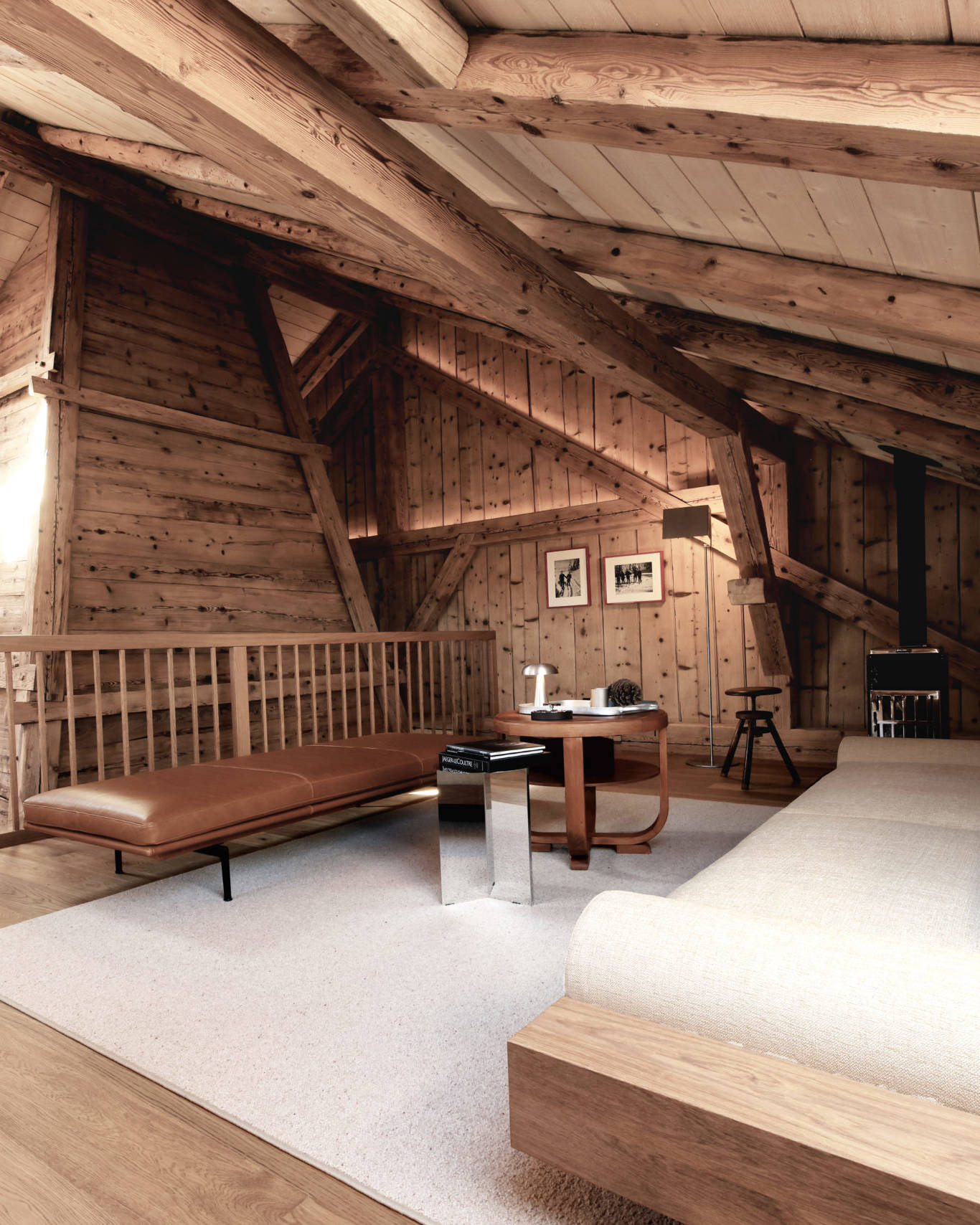 La grange ouverte s’est transformée en lieu de réception aux volumes maîtrisés, dominée par une mezzanine intime. Au centre, le tuyé, cheminée pyramidale emblématique des chalets jurassiens, demeure intact dans son esprit. Témoignage d’un passé rural assumé, il incarne cette idée chère à la Maison, faire dialoguer les origines avec le présent. À l’extérieur, les façades revêtues de tavaillons rappellent l’exigence du geste juste. Coupés et posés à la main par des artisans locaux selon un savoir faire transmis depuis le XVe siècle, ils témoignent d’une restauration pensée dans la durée, privilégiant la transmission à l’effet et la fidélité au spectaculaire.