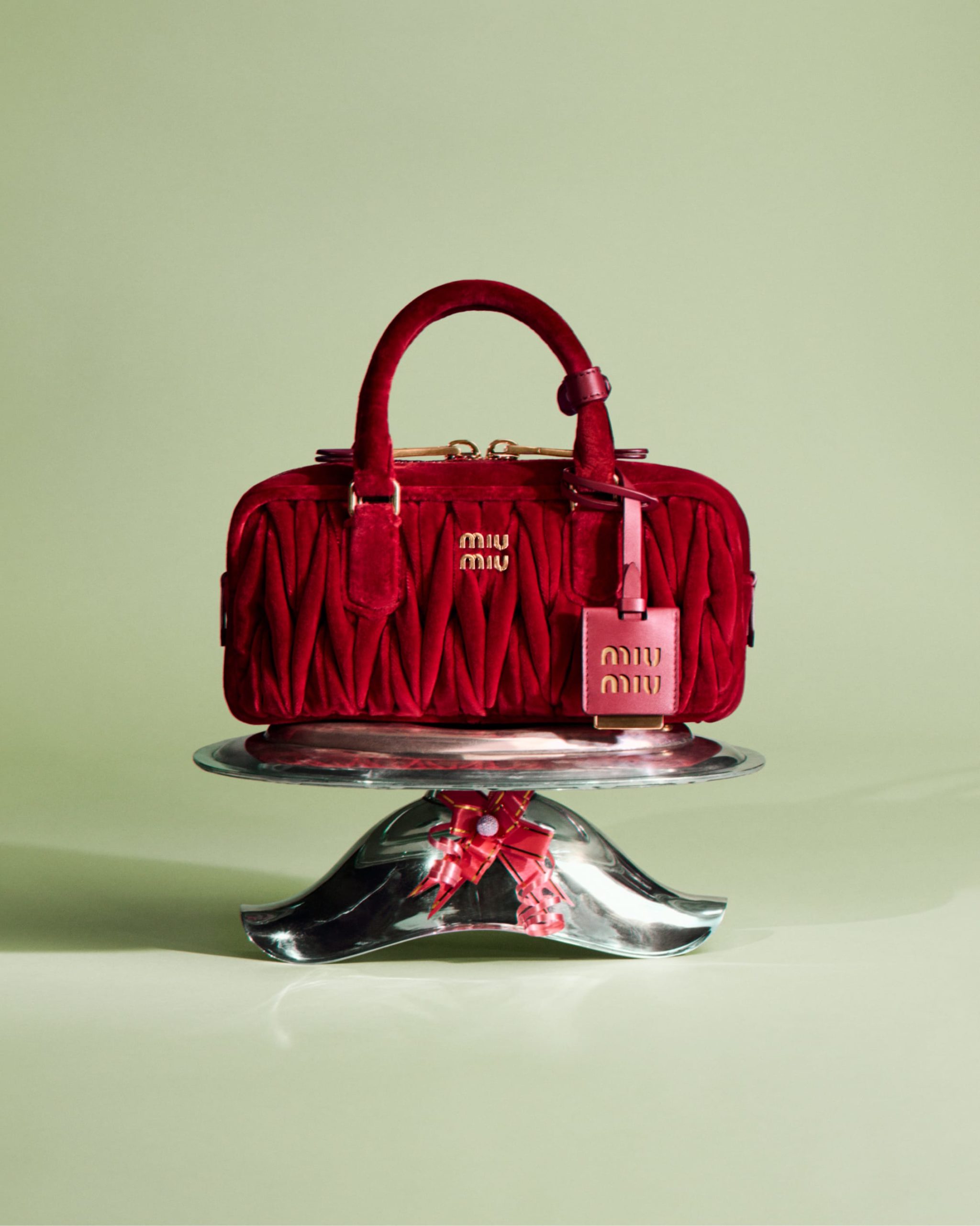 Pour cette nouvelle campagne, les matières sont à l’honneur. Le satin duchesse, froissé ou brodé dans des pastels délicats, dialogue avec un shearling patchworké aux allures artisanales tandis que les paillettes et le lurex apportent des éclats discrets. Une mode pensée pour les fêtes, mais loin des excès attendus. Chez Miu Miu, la féminité s’exprime à travers le détail, la nuance, l’élégance de la maîtrise