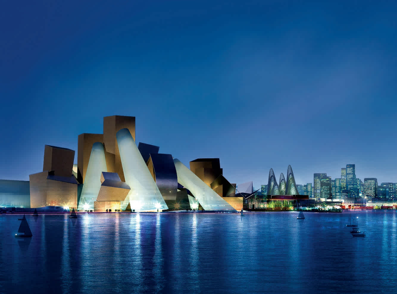 Dans les dernières années de sa vie, Gehry se consacre à un projet d’une envergure exceptionnelle : le Guggenheim Abu Dhabi. Là encore, son obsession pour la lumière et le verre guide chaque décision, avec des volumes audacieux conçus pour dialoguer avec le soleil et le paysage du Golfe. Le bâtiment, conçu comme une constellation de cones asymétriques, devait devenir l’aboutissement ultime de sa carrière, mêlant déconstructivisme et références aux architectures traditionnelles locales. Malheureusement, Frank Gehry ne verra pas le résultat achevé de ce dernier chef-d’œuvre. Pourtant, même inachevé, le Guggenheim Abu Dhabi témoigne de sa vision intransigeante et de sa capacité à repousser sans cesse les frontières de l’architecture.