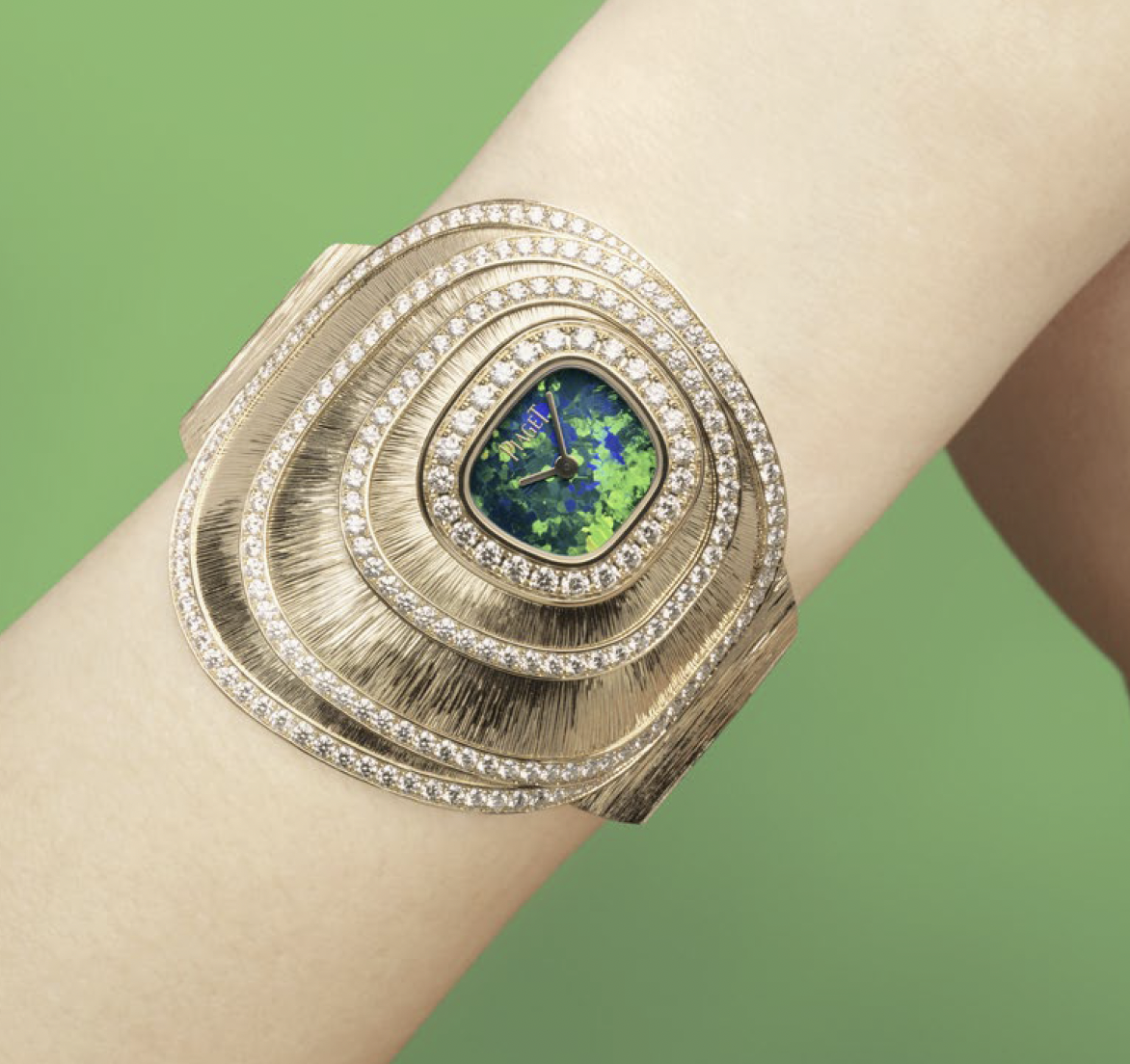 Cette approche trouve un écho particulièrement fort chez Piaget, dont l’histoire est profondément liée à l’utilisation des pierres ornementales. Dès les années 1960, la Maison introduisait des cadrans en lapis-lazuli, turquoise ou malachite, transformant la montre en objet joaillier. Aujourd’hui, cette tradition se prolonge avec des créations où les pierres sont taillées avec une précision extrême, parfois jusqu’à 0,4 mm d’épaisseur, un travail qui exige une maîtrise technique et artisanale exceptionnelle.