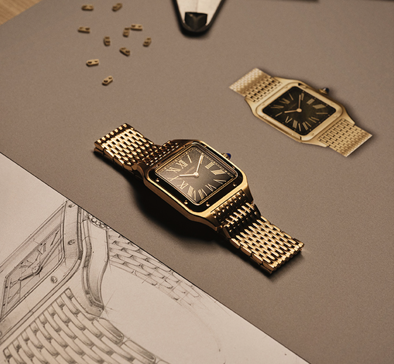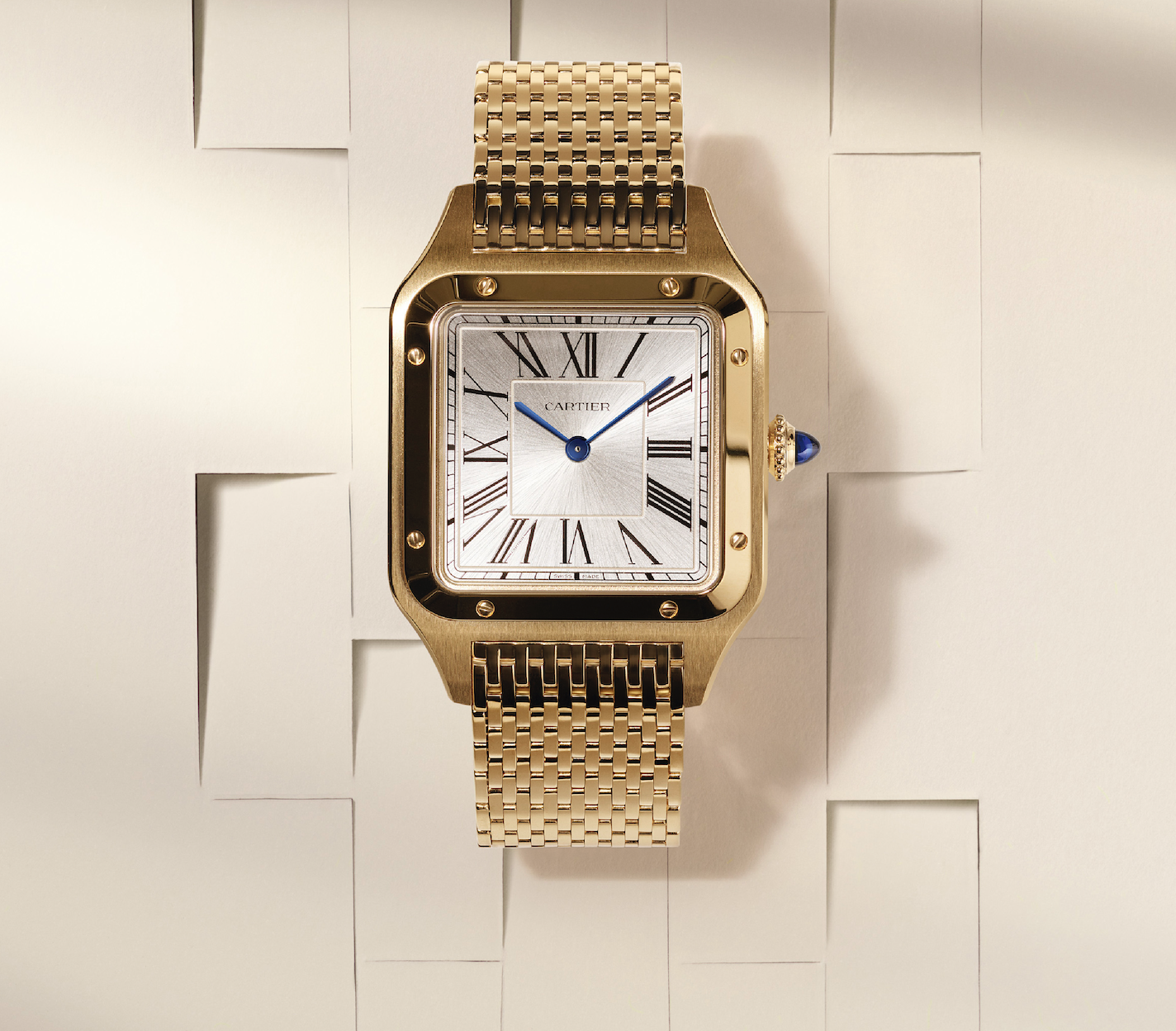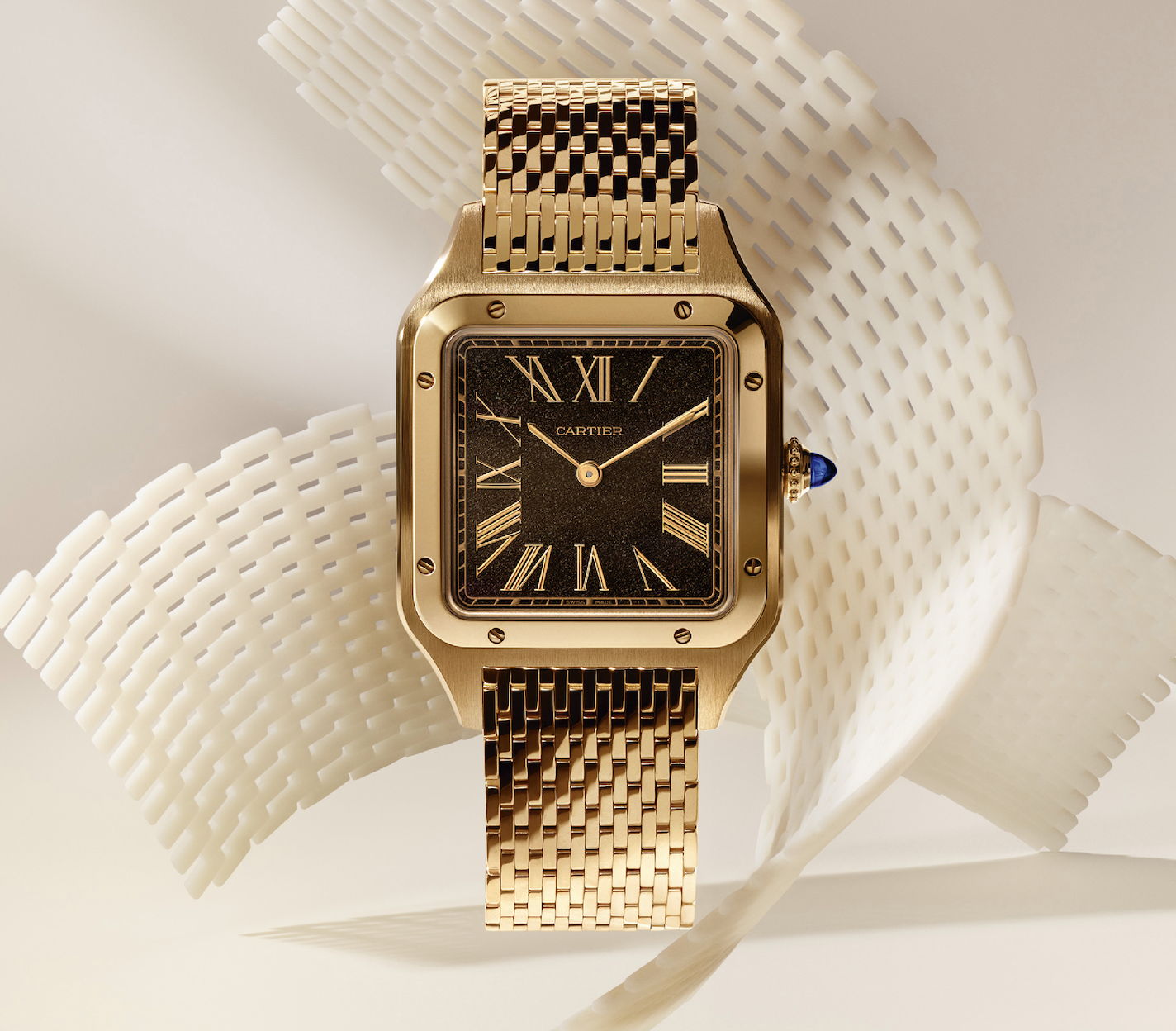 La Santos-Dumont de Cartier illustre parfaitement cette évolution. Fidèle à son design historique, elle se distingue par l’utilisation de matériaux nobles et par un travail particulièrement poussé sur les finitions. Le cadran peut notamment être réalisé en pierre, comme l’obsidienne dorée, dont les reflets irisés rendent chaque pièce unique.